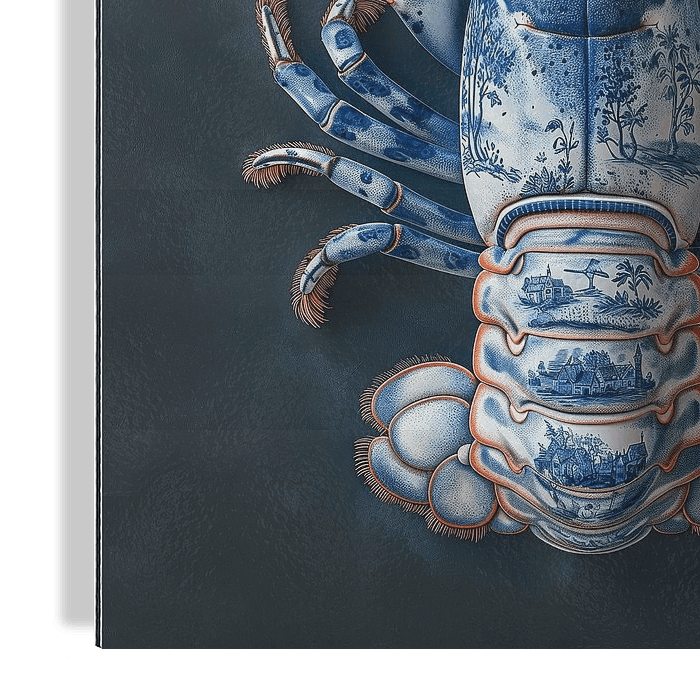 AI-generiertes Bild eines Hummers mit typisch delfterblauem Panzer vor einem luxuriösen dunklen Hintergrund