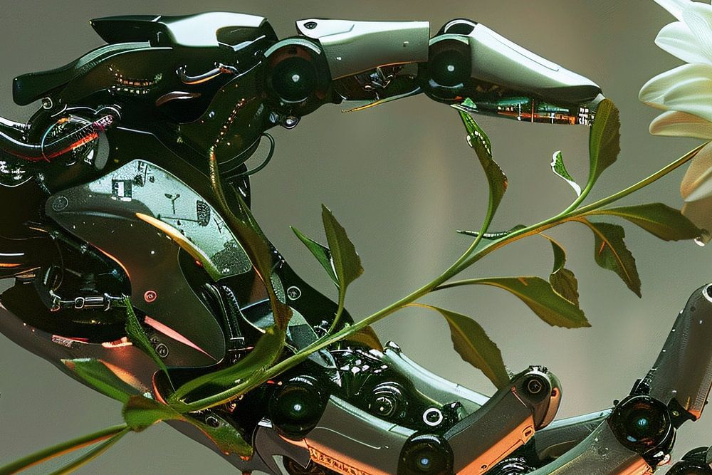 Dieses Kunstwerk fängt auf einzigartige Weise die faszinierende Interaktion zwischen Technologie und Natur ein. Ein hyperrealistischer Roboterarm, der mit viel Liebe zum Detail gefertigt wurde, hält vorsichtig eine zarte Blume. Die Kombination aus fortschrittlicher Technologie und der Schönheit der Natur wirft Fragen über die Zukunft von Mensch und Maschine auf. Futuristisch und poetisch zugleich, passt diese Skulptur perfekt in einen modernen Raum und bietet einen interessanten Gesprächsanlass für jeden Raum. Sie ist eine Ode an die Komplexität der Technologie und die Einfachheit der Natur, vereint in einer starken visuellen Aussage.