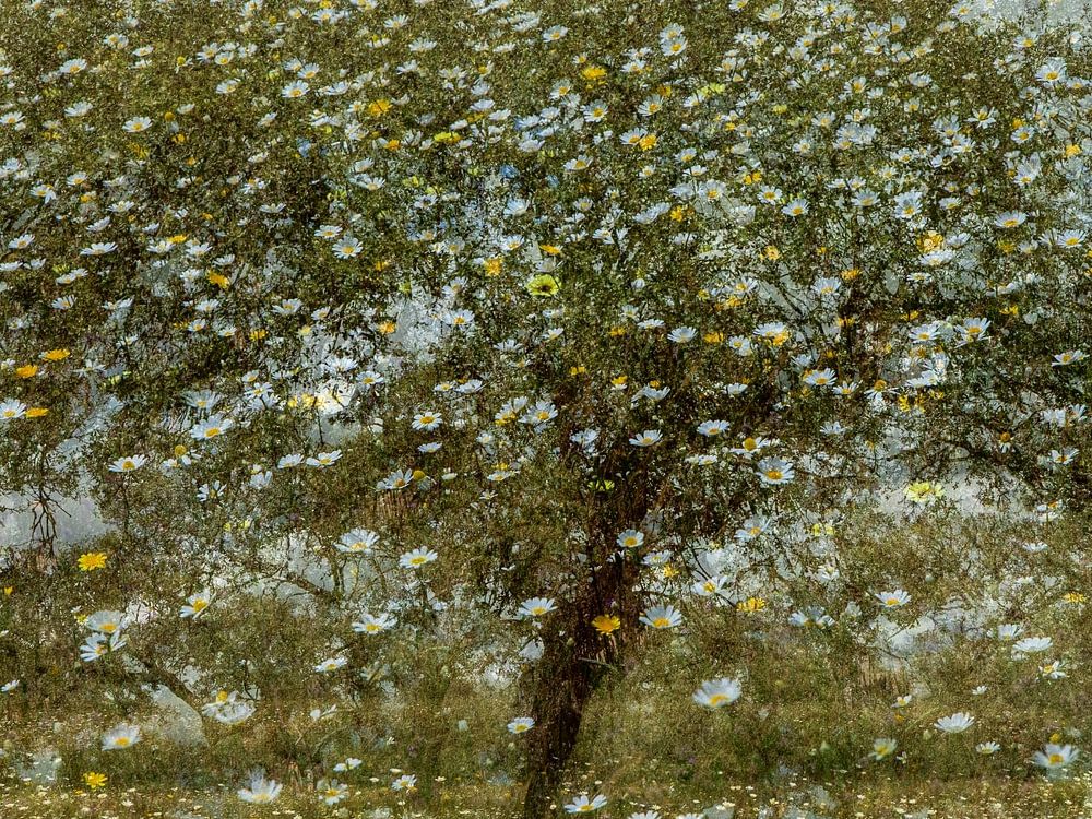 Hier wurde eine Steineiche zum Thema des Fotos. Ich habe vier Fotos'in der Kamera übereinander gemacht, jedes Mal mit einem Schwenk nach links. Auf diese Weise erhält man ein verträumtes Bild des Baumes. Das fünfte Foto, das ich ebenfalls mit der Kamera übereinander aufgenommen habe, zeigt das Meer aus weißen Blumen, das den Boden um die Bäume herum bedeckt. Da dies das letzte Foto war, bedecken die Blumen das gesamte Bild. Die Atmosphäre und die Farben erinnern an den französischen Maler Claude Monet aus dem 19. Jahrhundert.