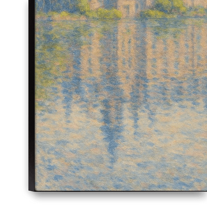 Im Zentrum von Den Haag erhebt sich der historische Binnenhof aus dem Hofvijver-See, dessen Türme sich in perfekter Symmetrie spiegeln. Der Künstler nähert sich diesem Ort der Geschichte mit Monets Sensibilität für ruhiges Wasser und bewölkten Himmel und verwandelt Stein und Politik in Heiterkeit und Farbe.
