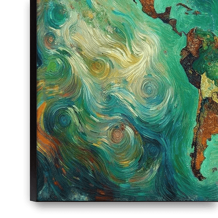 Diese lebhafte abstrakte Weltkarte im impressionistischen Stil zeigt die Kontinente in einer wunderschönen Symphonie aus gewundenen, organischen Formen und Wirbelstrukturen. Die gedämpften Erdtöne der Landmassen wirbeln in sattem Grün, Siena, Kirsche und Bernstein, umgeben von türkisfarbenen und safrangelben Spiralen, die an bewegte…