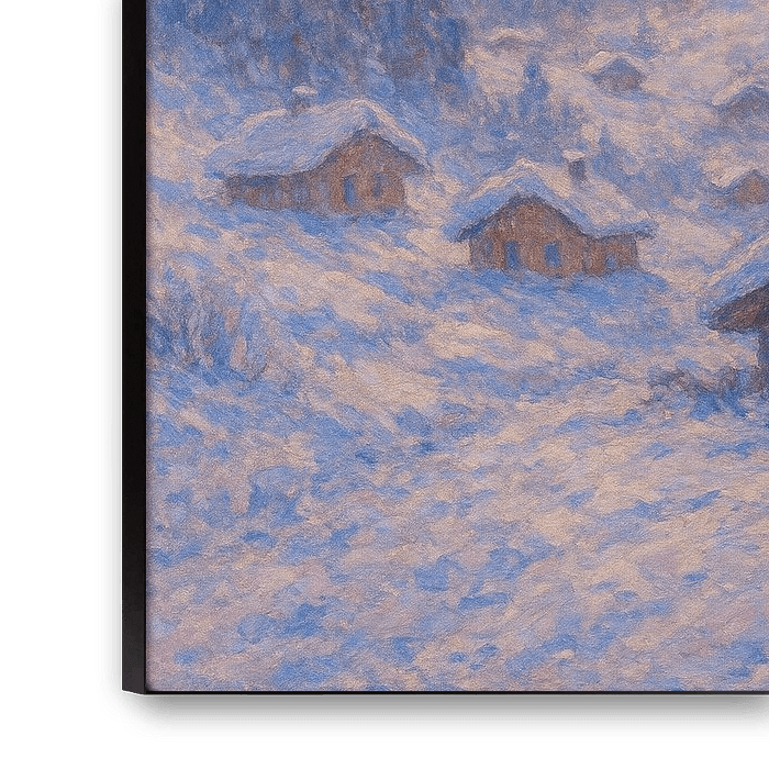 Es gibt hier eine Intimität, eine Einladung, stehen zu bleiben und die Kälte in der Luft zu spüren, zu beobachten, wie die Farbe den Schatten ersetzt, wenn die Sonne aufgeht. Es verkörpert die Seele des Winters nicht als Trostlosigkeit, sondern als Erneuerung, wo das Licht die Kälte in Schönheit verwandelt. Die moderne Hommage des Künstlers an Monet fängt diesen flüchtigen Moment ein, in dem die Natur zwischen Nacht und Tag innehält.
