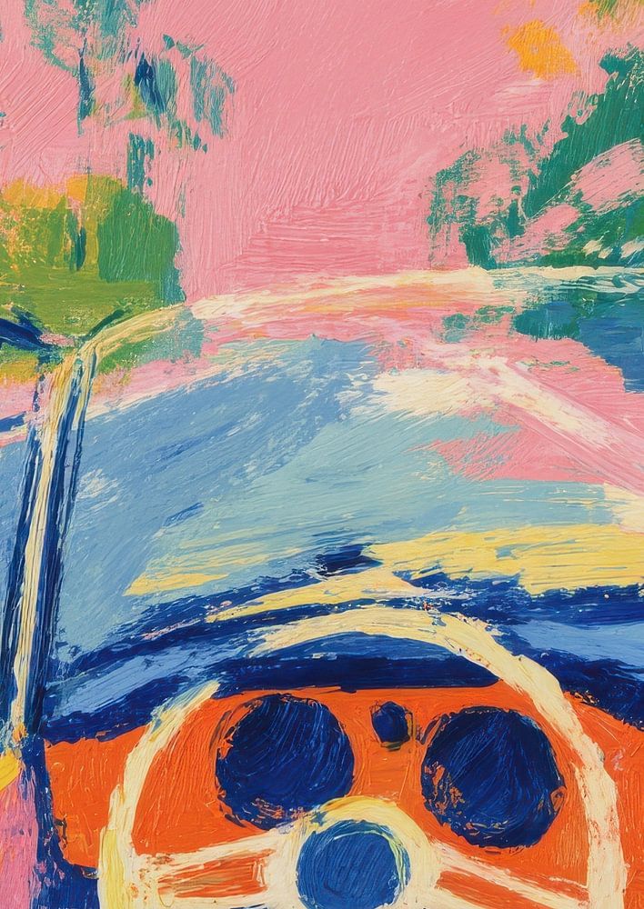 Dieses farbintensive, impressionistische Gemälde zeigt das Innere eines Cabrios aus Fahrerperspektive. Das Armaturenbrett wechselt von Blau zu Orange, betont durch runde Anzeigen und ein weiß-blaues Lenkrad im Zentrum. Die Windschutzscheibe reflektiert Himmel und Umgebung in Rosa- und Blautönen. Links ragen palmengesäumte Formen in…