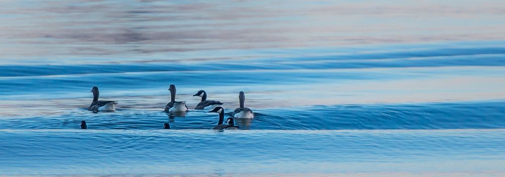 Canadese ganzen die in de Maas zwemmen op de golven die door een zojuist gepasseerd schip zijn veroorzaakt