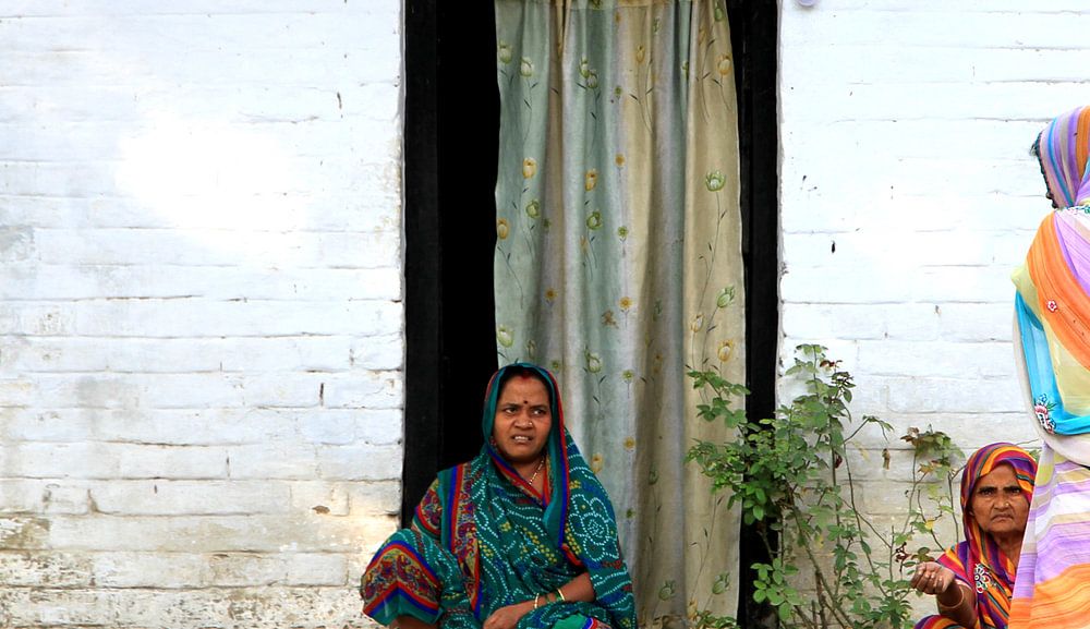 Die Darstellung einer Alltagsszene in Indien. Die Damen sitzen und reden.