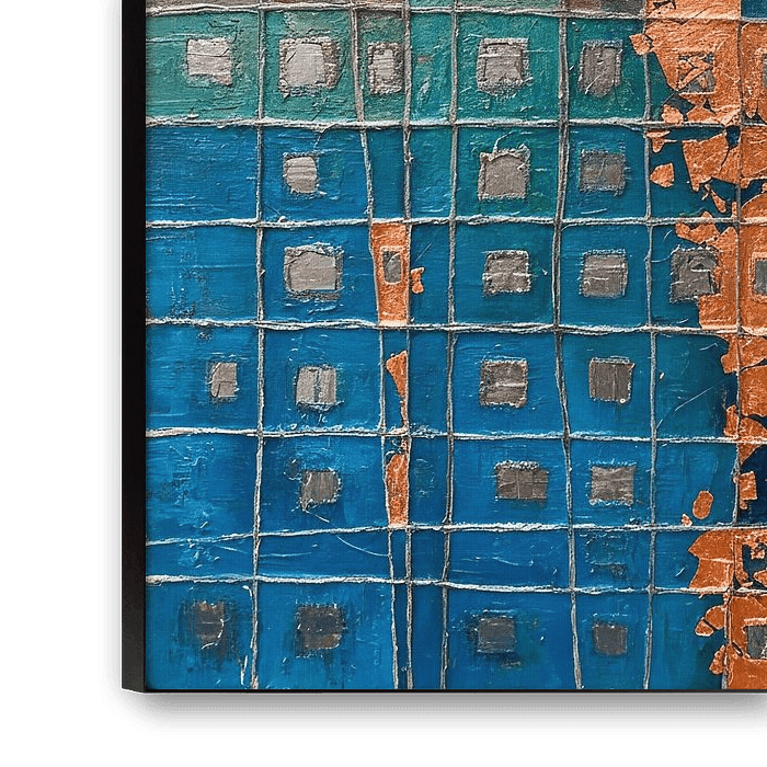 Die Farben bestehen aus einer kühlen Palette von tiefem Kobaltblau, Türkis und Grau/Olivgrün, die eine maritime oder erdige Tiefe vermitteln. Dieses kühle Gleichgewicht wird durch ein diagonales und zentrales kupfer-orangefarbenes Element, das dem Werk einen dynamischen und fast verwitterten Charakter verleiht, kraftvoll durchbrochen.