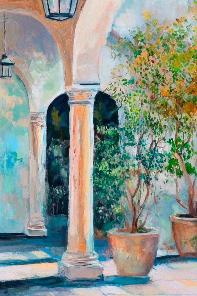 Ein einladender Patio entfaltet sich, wo warmes Licht sanft die Bögen beleuchtet. Die Pflanzen in großen Töpfen sprießen üppig, während die charmante Laterne ein Gefühl von Ruhe und zeitloser Eleganz verbreitet. Sanfte Pastelltöne harmonieren, und jede Ecke verspricht eine Geschichte der Entspannung und des Lebens im Freien.