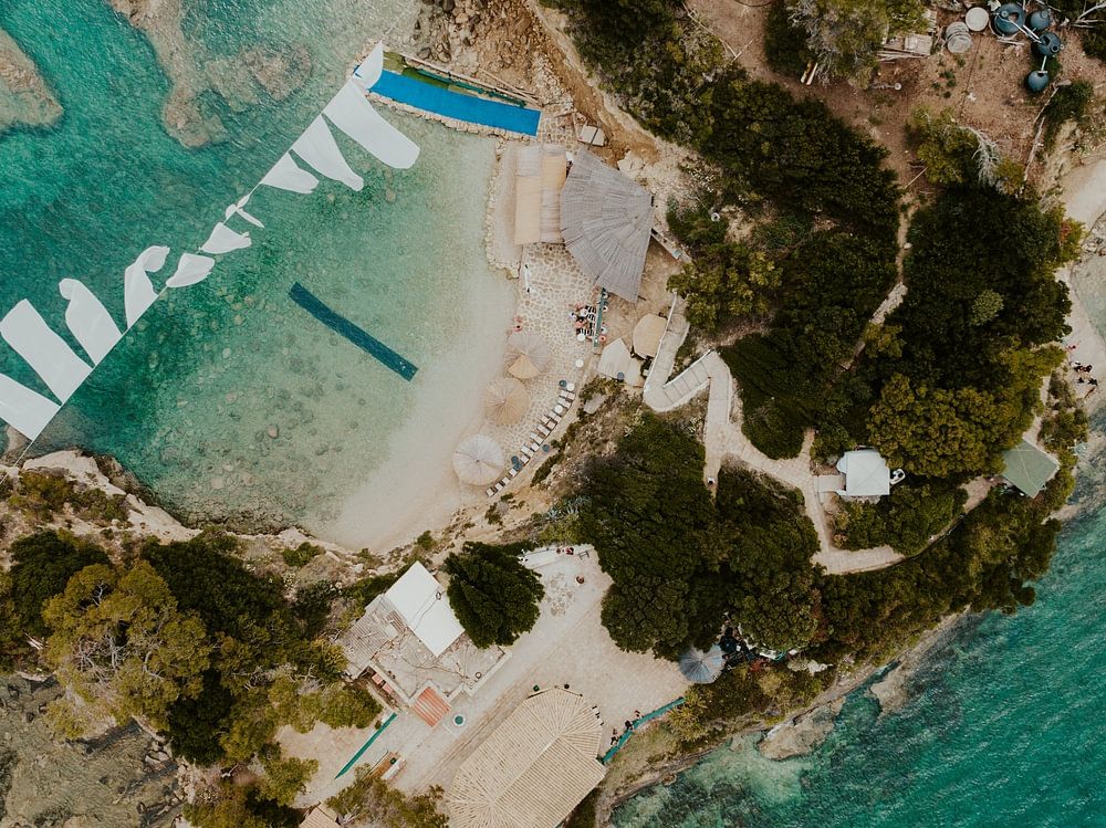 Aus der Luft entfaltet sich ein fast surreales Bild: die bezaubernde Insel Cameo, die über einen Holzsteg mit dem Festland von Zakynthos verbunden ist und über kristallklarem türkisfarbenem Wasser schwebt. Was diesen Ort so besonders macht, sind nicht nur die steilen Klippen und die Pinien, die sich an die Insel klammern, sondern auch die großen, flatternden Leinwände, die wie anmutige Fahnen in der Meeresbrise tanzen - ein bezauberndes Detail, das man nur dann wirklich sieht, wenn man genau hinsieht.