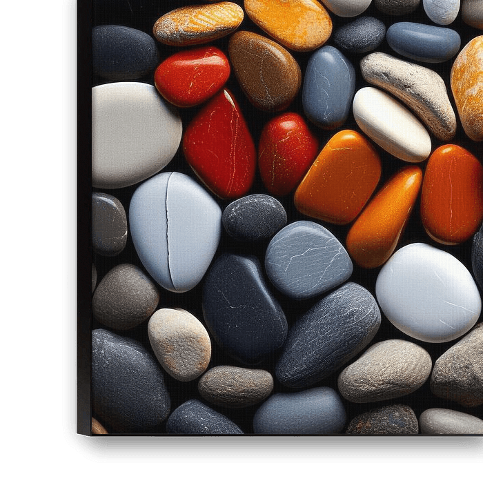 Jeder Stein scheint ein einzigartiges Kunstwerk für sich zu sein, während die Gesamtheit eine harmonische Farbpalette bildet. Dieses Bild nimmt den Betrachter mit auf eine visuelle Entdeckungsreise durch den faszinierenden Mikrokosmos der farbigen Kieselsteine.