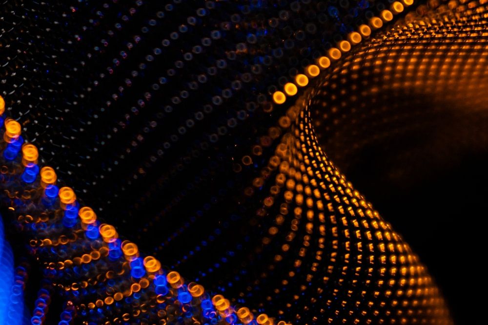 Dieses Werk zeigt eine abstrakte Fotografie, die metallisch irisierenden Stoff in sanft fließenden Falten einfängt. Die Oberfläche reflektiert gezielt gesetztes Licht, wodurch ein lebendiges Farbspiel aus Blau- und Orangetönen entsteht. Die leuchtenden Punkte im Bild sind das Ergebnis bewusster Unschärfen – sogenanntes Bokeh –, das durch eine geringe Tiefenschärfe erzeugt wurde. Diese Technik verleiht dem Bild eine fast schwebende Leichtigkeit und verstärkt die visuelle Tiefe.