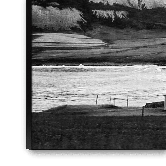 Haus mit rotem Dach in schwarzweißer Landschaft Islands