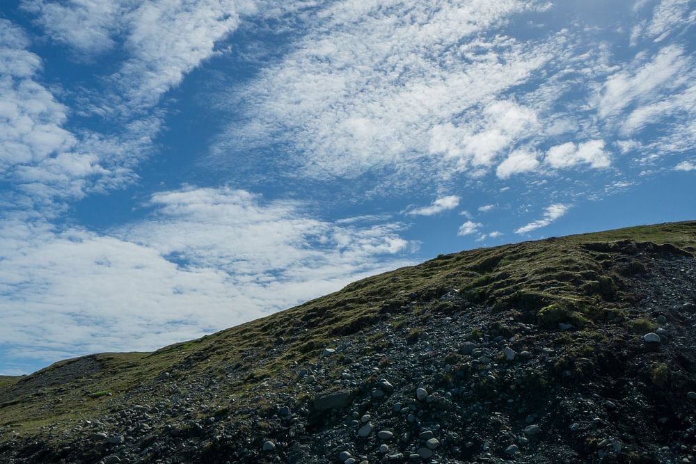 Island - Schwarze Steinhügel, bedeckt mit grünem Gras und blauem Himmel