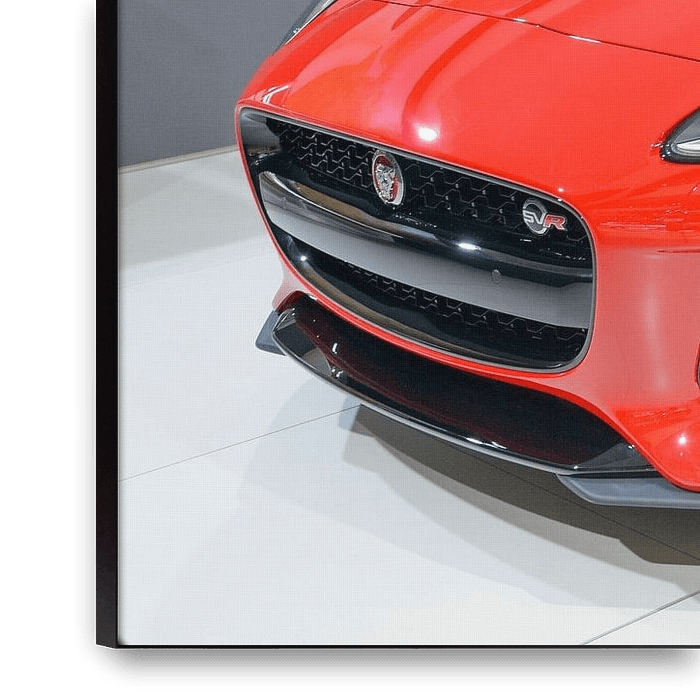 Roter Jaguar F-Type SVR, zweisitziger Sportwagen, Frontansicht. Der F-Type SVR ist mit einem aufgeladenen 5,0-Liter-V8 mit 567 PS ausgestattet, der den Wagen in 3,5 Sekunden von 0 auf 100 km/h und auf eine Höchstgeschwindigkeit von 322 km/h bringt.