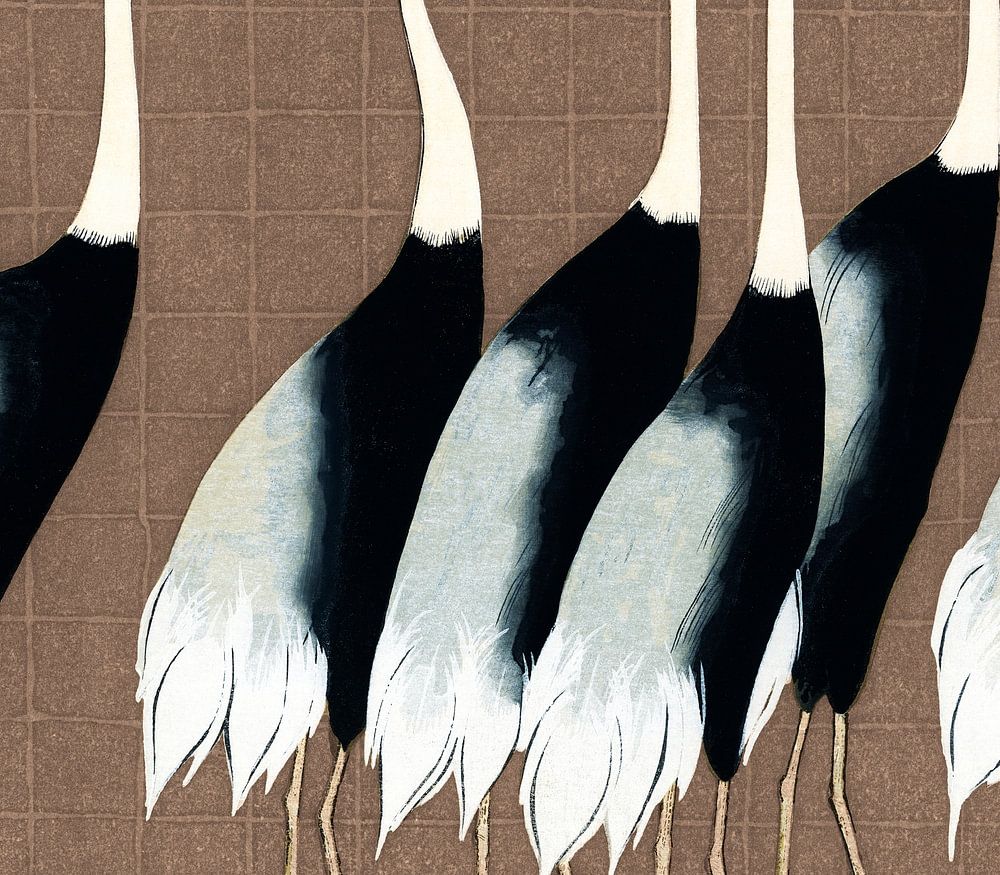 Japan Kraniche in einer beruhigen Darstellung als Malerei auf warmen gelben Hintergrund.