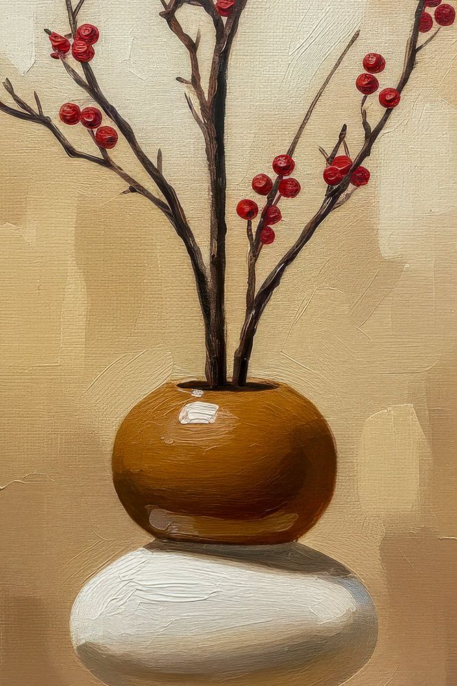 Bringen Sie Ruhe, Wärme und Schlichtheit in Ihr Zuhause mit diesem Japandi-Stillleben. Das Kunstwerk zeigt eine gestapelte Vase in sanften Erdtönen, gefüllt mit zarten Zweigen von roten Beeren. Die minimalistischen Formen und der neutrale Hintergrund schaffen eine ruhige, natürliche Wohnatmosphäre, die nahtlos zu Japandi-Interieurs, skandinavischer Einfachheit und modernen Minimalisten passt.