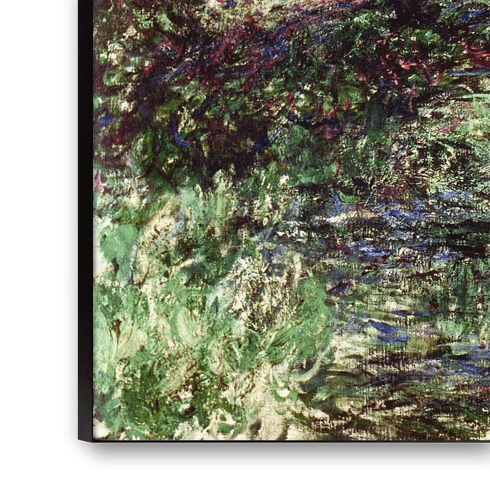 Das Motiv der japanischen Brücke im Bildmittelpunkt ist eines der seriellen Werke aus seinem Garten. Frontal wird die japanisch gestaltete Holzbogenbrücke von der Westseite seines großen Teiches gezeigt, der von hohen Trauerweiden umgeben ist. Wegen der reichen Ufervegetation bleibt der Blick im grünen Dickicht gefangen, der Horizont und der Himmel können nicht ausgemacht werden, aber sind in den Wasserspiegelungen angedeutet, weshalb Monet seine Bilder als “Reflexlandschaften” bezeichnete. Das parallele Holzgeländer an der Brücke weist die einzig linearen Strukturen im Bild auf, doch dem Betrachter wird eine genaue Fokussierung auf das Motiv erschwert. Unscharf und von den Bildkanten abgeschnitten wölbt sich der Weg über den Teich, während darunter gelbe, grüne und rote Nuancen in gezielten, aber momenthaften Pinselstrichen und -tupfern ein Konvolut aus Algen, Seerosenblüten und -blättern sowie reflektierenden Wasserfächen bilden.