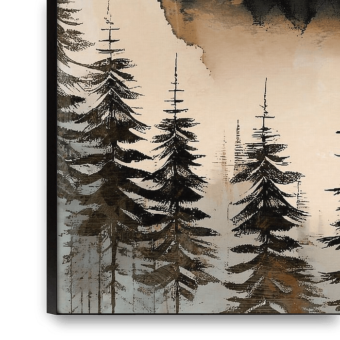 Bestelle dieses abstrakte Wandbild Japanische Gebirgslandschaft mit Wald Japandi Surrealismus von FRESH Fine Art als Reproduktion auf Leinwand, Alu-Dibond, als Poster, Fototapete oder Acrylglasbild.
