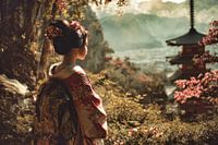 malerische japanische Kunst mit einer fiktiven Geisha, die auf eine wunderschöne Landschaft blickt