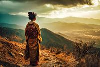 malerische japanische Kunst mit einer fiktiven Geisha, die auf eine wunderschöne Landschaft blickt