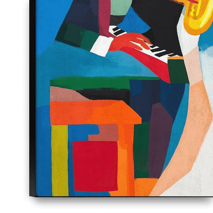 Ein farbenfrohes abstraktes Gemälde einer Jazzband, die mit Leidenschaft auftritt. Die kräftigen Farbtöne und fließenden Formen erwecken den Rhythmus und die Improvisation des Live-Jazz zum Leben