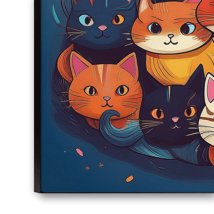 Nahaufnahmen von Katzenköpfen füllen das Werk.