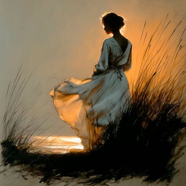 Ein Kunstwerk, das die Silhouette einer Frau zeigt, die anmutig an einem ruhigen Meer bei Sonnenuntergang steht. Die Frau trägt ein fließendes, helles Kleid, das sanft im Wind flattert und ihre elegante Pose unterstreicht. Ihr Körper wird von dem warmen, goldenen Licht der untergehenden Sonne angestrahlt. Die Gesamtkomposition erweckt…