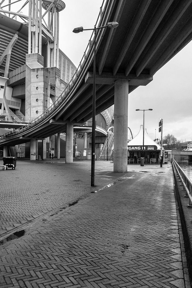Dieses schöne Schwarz-Weiß-Foto ist Teil einer Serie und zeigt die berühmte Johan-Cruijff-Arena in Amsterdam, die Heimat des weltberühmten Fußballvereins AJAX.