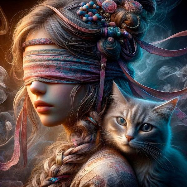 Der Titel trifft es nicht ganz, denn auf diesem Bild ist alles Mögliche zu sehen. Eine junge Frau mit einer Augenbinde aus einem schönen Stoff, Verzierungen im Haar und einem süßen Kätzchen auf der Schulter. Im Hintergrund ist Rauch zu sehen. Und das alles in schönen, ruhigen Farben.