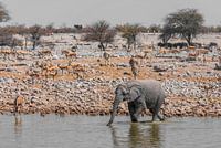 Junger Elefant am Wasserloch im Hintergrund eine Herde Springböcke
