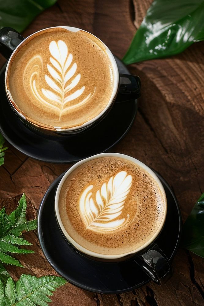 Dieses Kunstwerk fängt die Essenz eines entspannten Kaffeemoments ein, indem es zwei kunstvoll gestaltete Latte in schwarzen Tassen zeigt, umgeben von üppigem Grün. Die Kombination aus den detailreichen Blättern und der geschmackvollen Latte Art vermittelt eine Atmosphäre der Ruhe und des Genusses. Ideal für Cafés, Küchen oder Wohnzimmer, bringt dieses Bild ein Stück Natur und den Duft von frischem Kaffee in Ihren Raum.