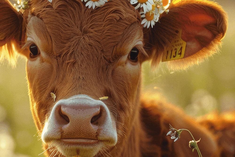 Lassen Sie sich verzaubern von der zarten Anmut dieses liebenswerten Kalbes, das mit einem zierlichen Gänseblümchenkranz inmitten einer sommerlichen Blumenwiese posiert. Das Kunstwerk strahlt eine Atmosphäre der Freiheit und des Neubeginns aus, die das Herz jedes Naturfreundes und Romantikers höherschlagen lässt. Die feinen Farbnuancen und die sanfte Ausstrahlung des Kalbes bieten eine harmonische Ergänzung für jeden Raum, der eine Berührung von pastoraler Poesie verträgt. Ideal für ein heimeliges Landhaus, eine stille Stadtwohnung oder als Geschenk, das Natur und Freude ausstrahlt.