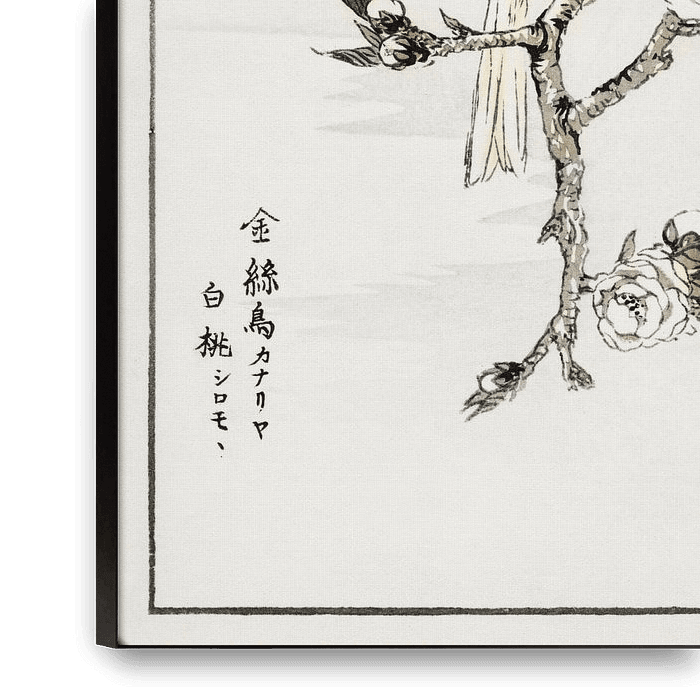Bestelle diese Malerei Kanarienvogel und Pfirsich Illustration von Numata Kashu von Studio POPPY als Reproduktion auf Leinwand, Alu-Dibond, als Poster, Fototapete oder Acrylglasbild.