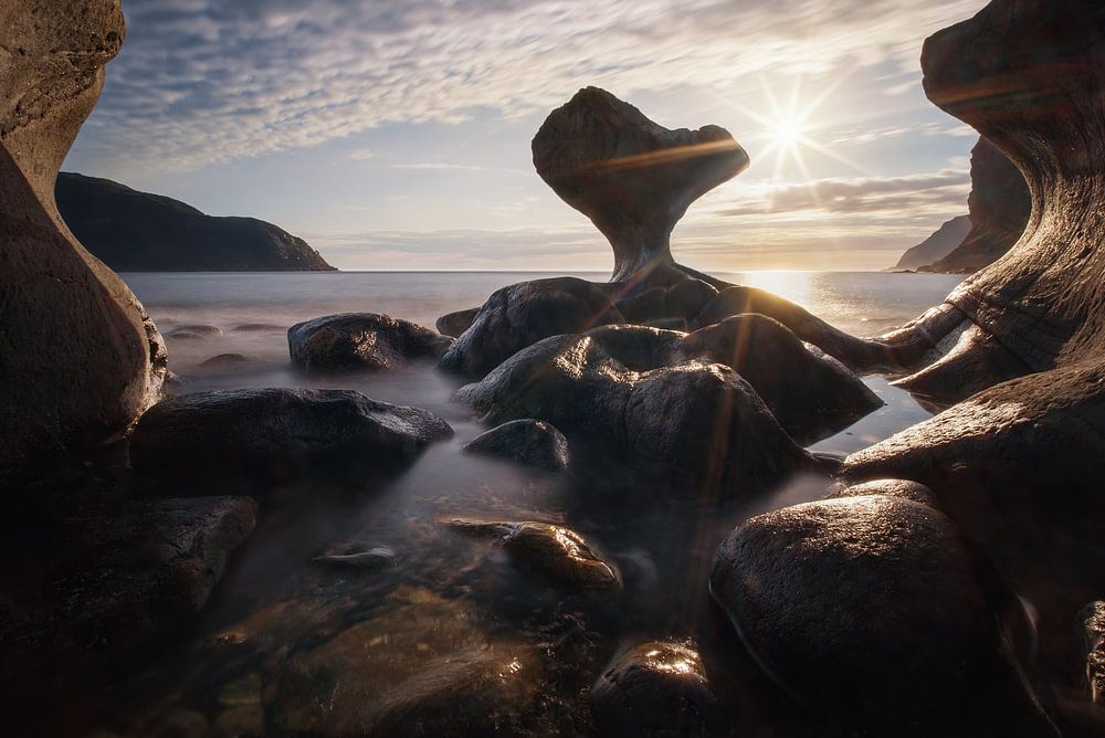 Maloy coastline with Kannestein Rock in sunset light, Norway