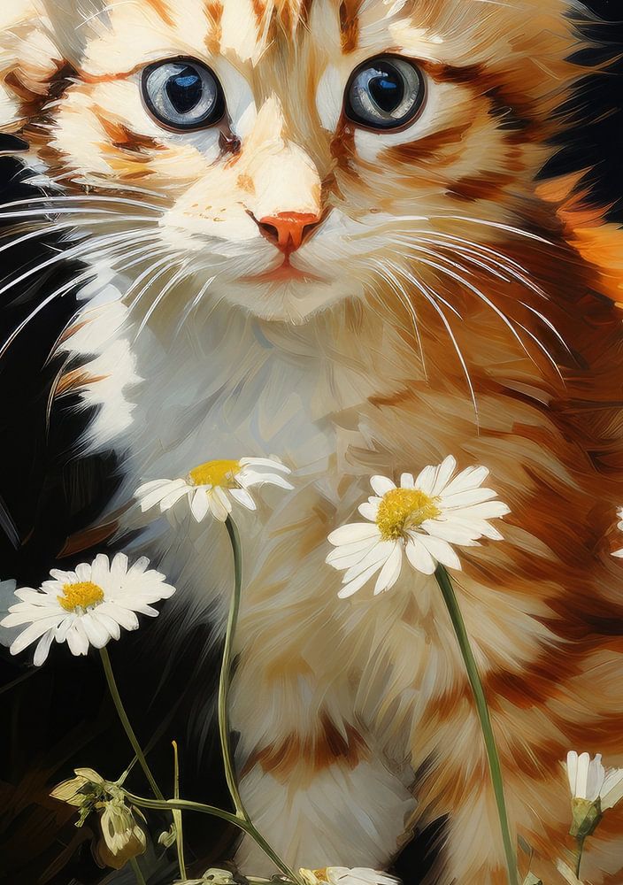 Malerische Darstellung einer kleinen beigen Katze, umgeben von Margeriten.
