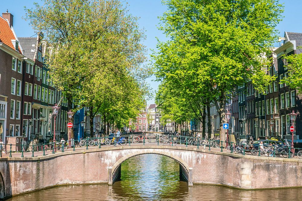 Die Ecke Keizersgracht und Leidsegracht mit Touristen, die an einem sonnigen Tag an den Kanälen die Stadt genießen