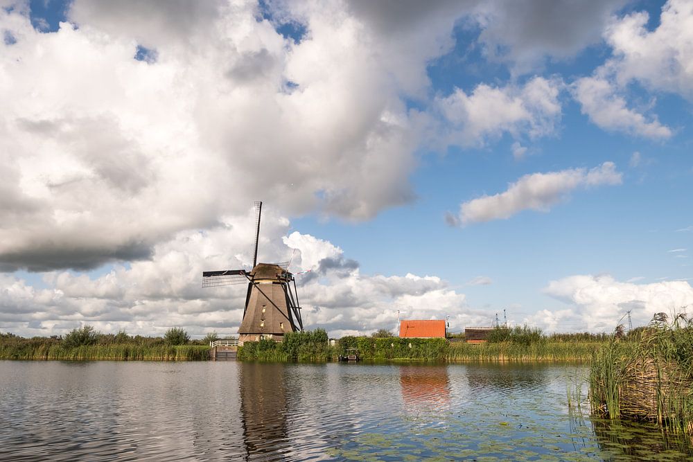 auf dem Wasser befinden sich mehrere Windmühlen in Kinderdijk in Holland.