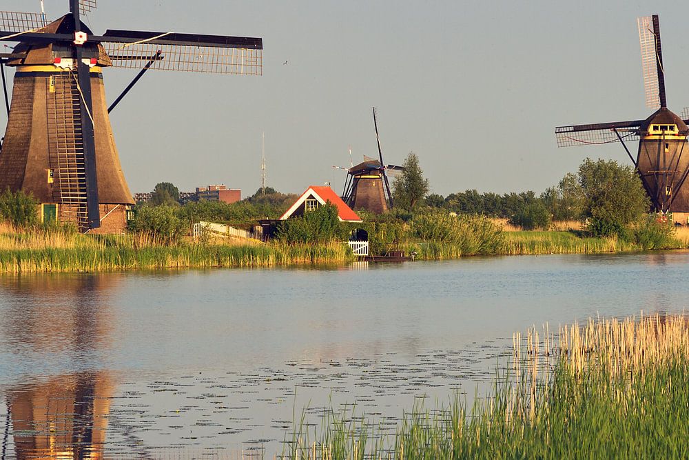 Schöne Aufnahme der Windmühlen von Kinderdijk am späten Nachmittag mit einem leichten Vintage-Look