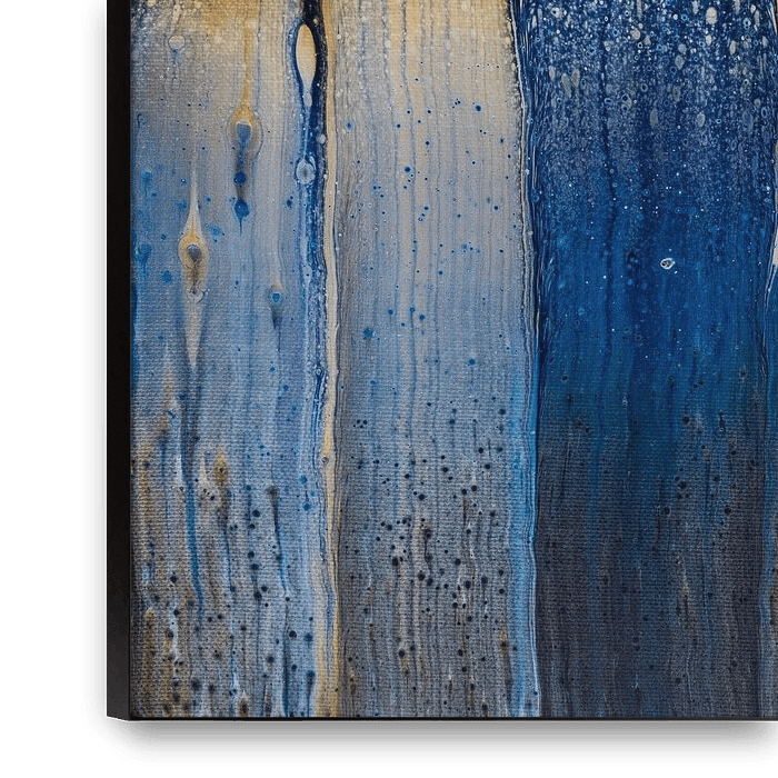 Die Farben des Kini-Strandes auf der Insel Syros in Griechenland waren die Inspiration für dieses abstrakte Gemälde. Ausgeführt in Fluid Art Paint Technik in den Farben Blau, Türkis, Gelb, Gold und Braun.
