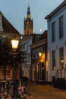 Der Turm von Amersfoort O.L.V. bei Mondschein. Eine kleine malerische Straße in der Mitte des Zentrums.