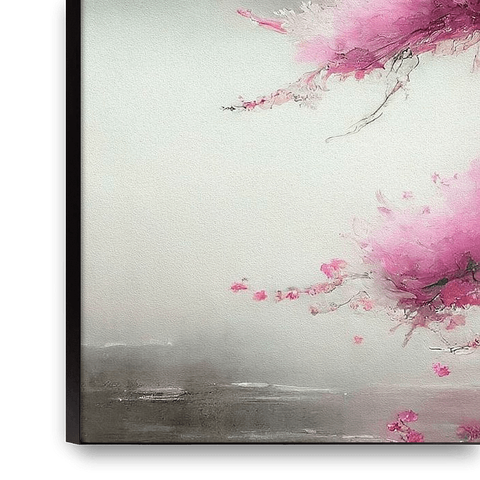 Ein farbenfrohes digitales Gemälde einer japanischen Kirschblüte an einem See im impressionistischen Stil. Inspiriert von der wunderschönen japanischen Frühlingslandschaft. Das Werk verleiht Ihrem Interieur eine weiche, warme Note.