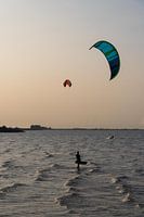 Kitesurfer im Meer während des Sonnenuntergangs.