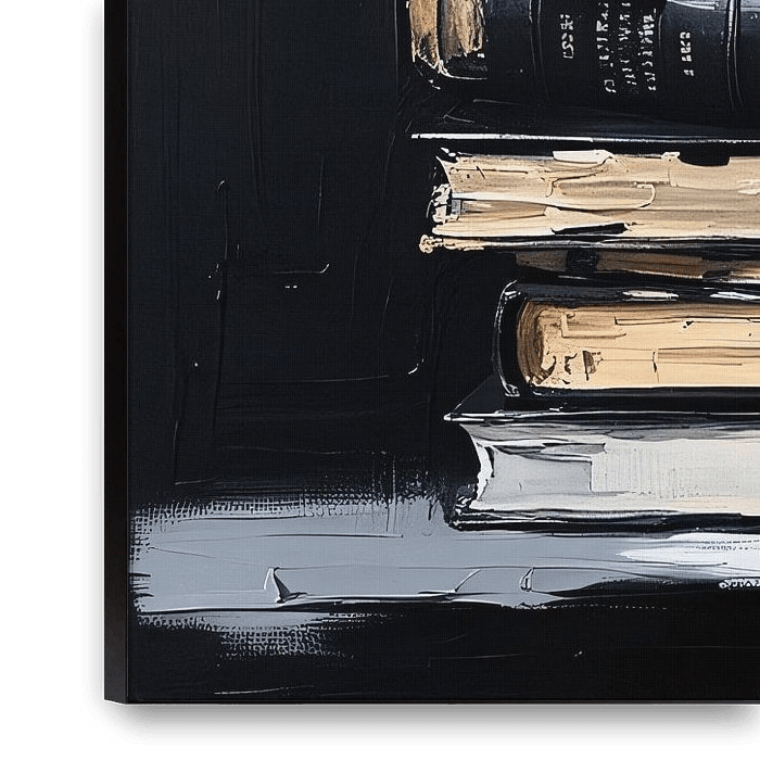 Dieses beeindruckende Gemälde zeigt zwei Stapel mit klassischen Büchern vor einem minimalistischen Hintergrund. Der Künstler hat durch die Verwendung von Schwarz- und Weißtönen einen dramatischen Kontrast geschaffen, der die Bücher hervorhebt. Die einfachen, kraftvollen Pinselstriche und die Farbgebung machen dieses Werk zu einem…
