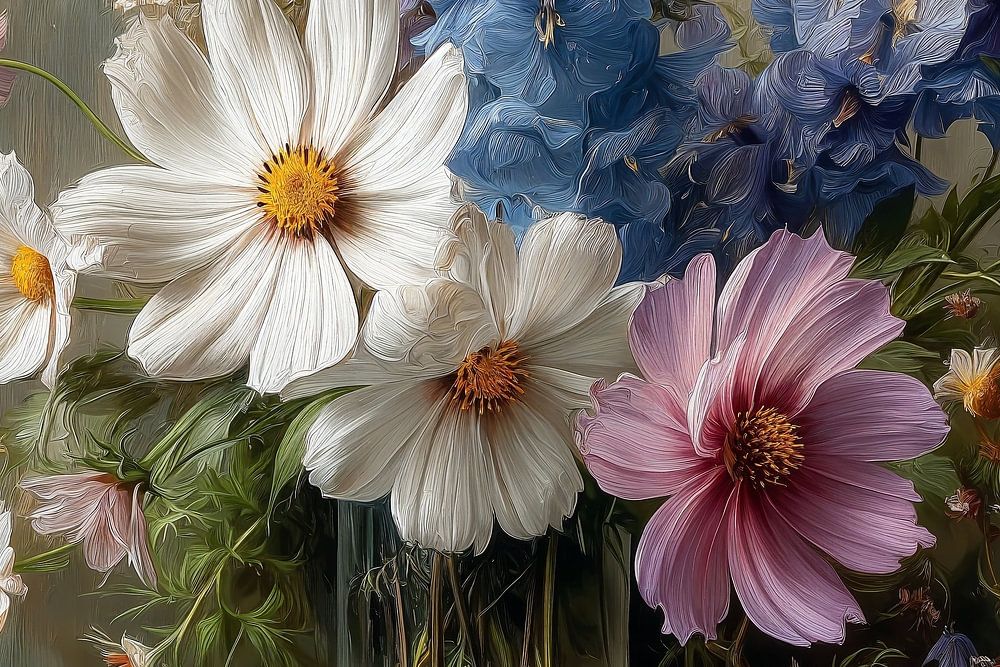 Ein attraktives Stillleben eines losen Sommerstraußes in einer Klarglasvase. Weiße Kosmosblüten bilden das Herzstück der Komposition, umgeben von stattlichem blauen Rittersporn und zartrosa Kosmeen. Der Hintergrund hat einen dezenten grün-grauen Farbton, der dem Ganzen ein zeitloses, klassisches Aussehen verleiht. Das Spiel von Licht und Schatten und die weichen, fast impressionistischen Pinselstriche verleihen dem Werk eine verträumte, romantische Atmosphäre.