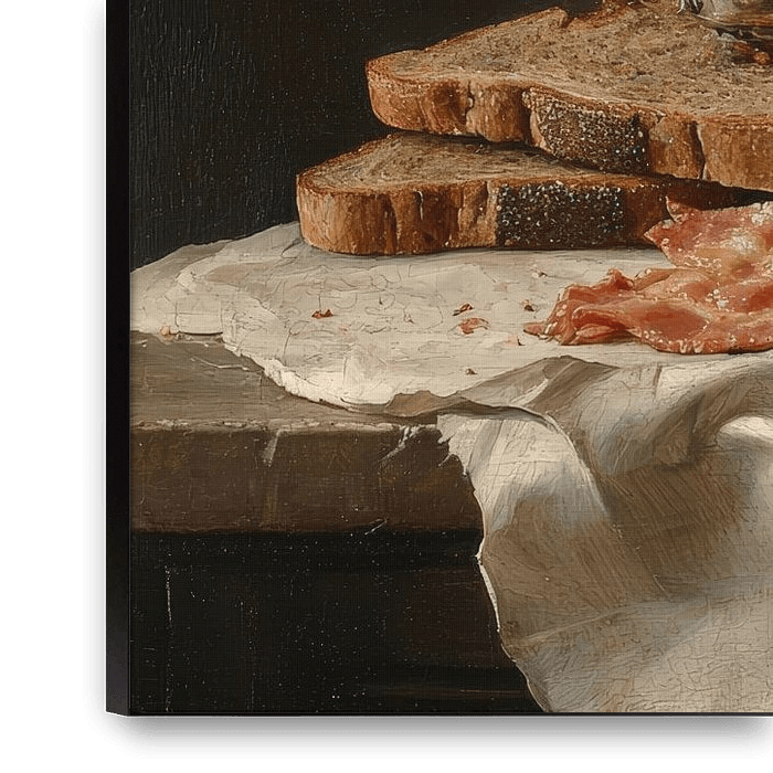 Dieses Stillleben vereint die Schlichtheit eines klassischen Frühstücks mit der Eleganz antiker Silberwaren. Im Mittelpunkt stehen zwei goldene Spiegeleier, die auf einem kunstvoll verzierten Silbertablett präsentiert werden. Der strahlende Dotter der Eier bildet einen lebendigen Kontrast zum dunklen Hintergrund und dem kühlen Glanz des…