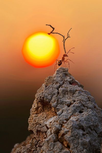 In dieser beeindruckenden Szene steht eine Ameise auf einem rauen, zerklüfteten Felsen, während die untergehende Sonne den Himmel in leuchtenden Orangetönen färbt. Ein kleiner Ast ragt von ihrem Kopf empor, als Symbol für Entschlossenheit und Widerstandsfähigkeit. Die kontrastreiche Bildkomposition fängt die Schönheit der Natur und den…