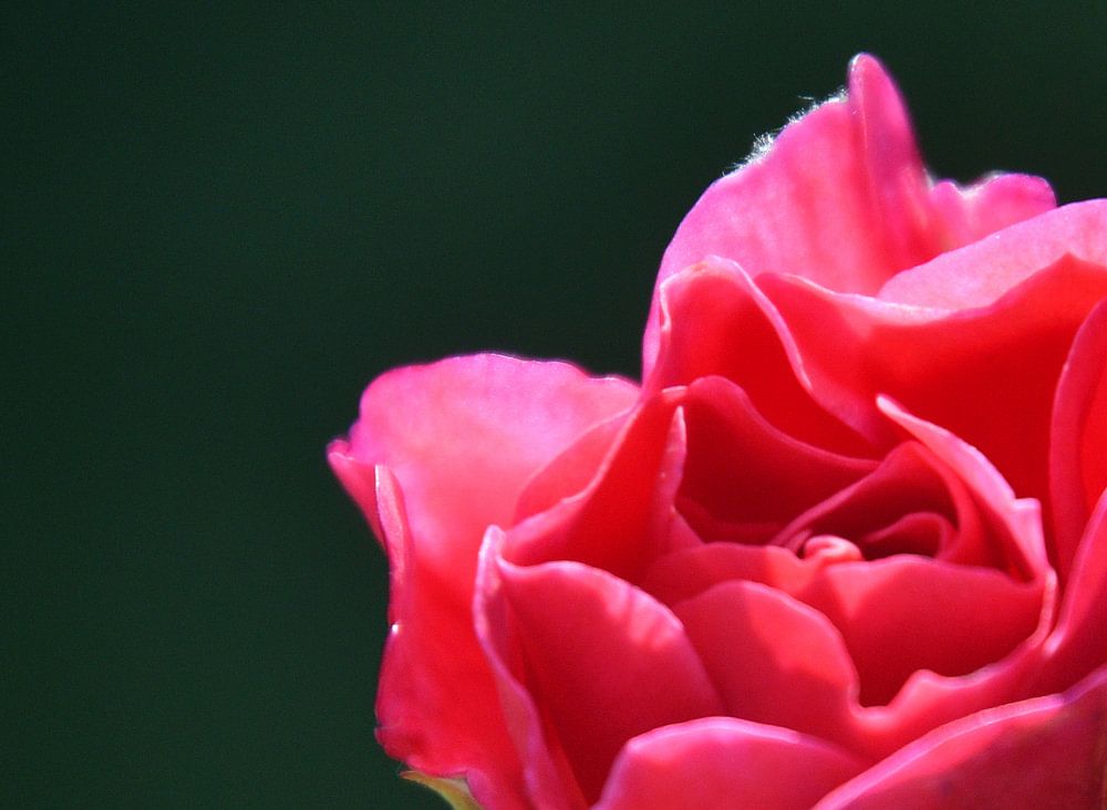 Kleine rotrosa Rosenblume mit grunerem Hintergrund