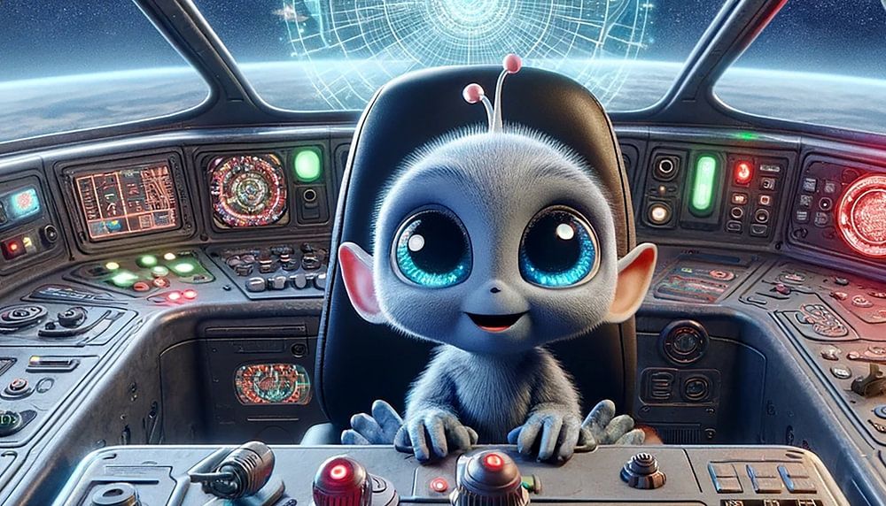 Vor dem Hintergrund des unendlichen Weltraums sitzt ein kleiner, entzückender Alien im Cockpit eines hochmodernen Raumschiffs, umgeben von einem Kaleidoskop an bunten Bedienelementen und Displays. Seine großen, leuchtenden Augen strahlen Neugier und Wunder aus, während er behutsam die Kontrollen berührt. Das Cockpit bietet einen atemberaubenden Blick auf ferne Planeten und Sternensysteme, und es scheint, als würde der junge Pilot eine Entdeckungsreise durch die Galaxie antreten. Die detailreichen Instrumente und das futuristische Design des Cockpits vermitteln das Gefühl einer fortschrittlichen außerirdischen Technologie.