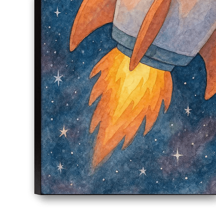 Wenn man genau hinsieht, erkennt man die feinen Details wie das winzige Glitzern in seinem Auge, den Lichtschatten auf dem Rumpf der Rakete und das sanfte Leuchten um die Sterne. Die Atmosphäre des Bildes ist warm und hoffnungsvoll. Das Gefühl von Freiheit, Neugier und Abenteuer, das jedes Kind kennt, wenn es in den Nachthimmel blickt.