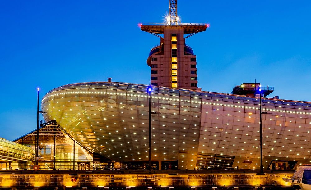 Zusammen mit der Stadt Bremen ist Bremerhaven Teil der deutschen Freien Hansestadt Bremen. Die Stadt liegt an der Mündung der Weser und ist ein wichtiger Hafen. Das Bild wurde in der blauen Stunde aufgenommen, wobei das Klimahaus und das Hotel Sail deutlich im Bild sind.