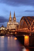 Blick entlang der Hohenzollernbrücke zum Kölner Dom, kurz nach Einschalten der Beleuchtung.